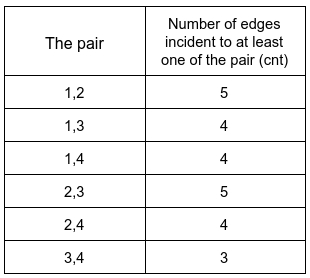 Explanation: The number of edges incident to at least one of each pair is shown above.Example 2:
