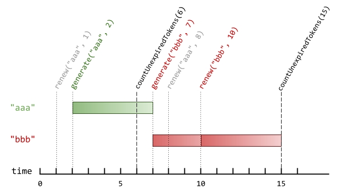 Note that if a token expires at time t, and another action happens on time t (renew or countUnexpiredTokens), the expiration takes place before the other actions.