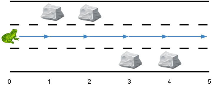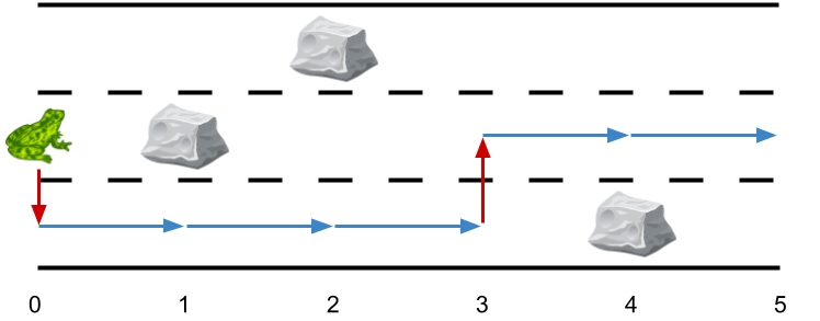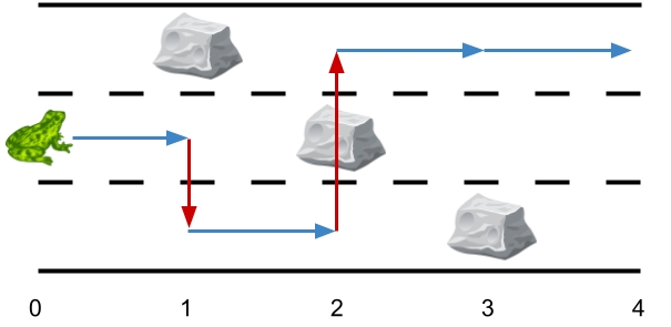 The frog can only travel from point i to point i + 1 on the same lane if there is not an obstacle on the lane at point i + 1. To avoid obstacles, the frog can also perform a side jump to jump to another lane (even if they are not adjacent) at the same point if there is no obstacle on the new lane.